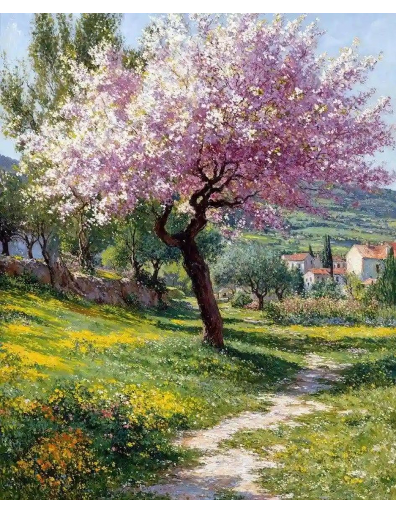 obrazy olejne, pejzaże, łąka, droga, kwitnąca jabłoń, migdałowiec, oil on canvas
