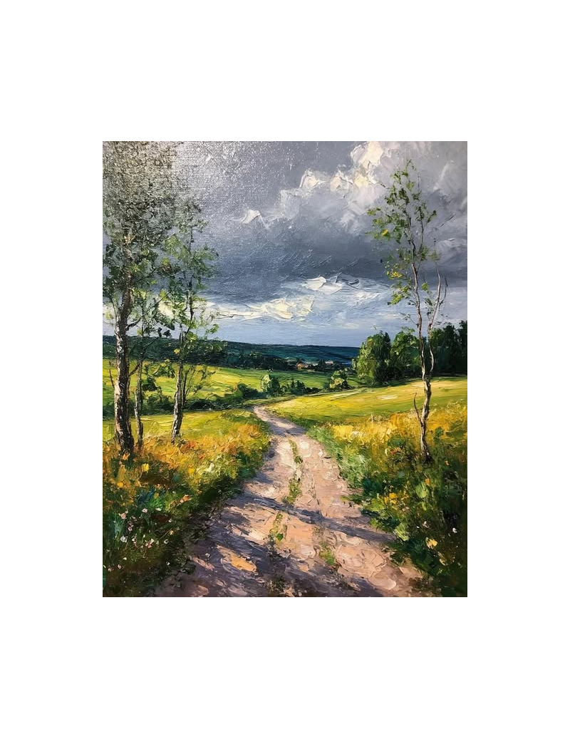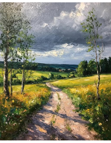 obrazy olejne, pejzaż, droga przez pola i łąki, oil on canvas, przepiękny widok, granatowe chmury, łąka w słońcu