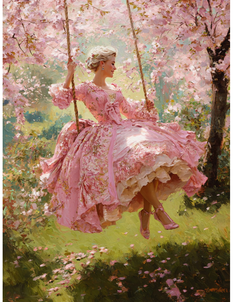 Obraz przedstawia elegancką scenę pełną pastelowych kolorów i nostalgii. Kobieta w różowej sukni siedzi na huśtawce, otoczona kwitnącymi drzewami. Suknia jest bogato zdobiona, co nadaje jej lekkości i wytworności. Gałęzie, okalające scenę, pełne są kwiatów w odcieniach różu, tworząc wokół niej swoisty baldachim. Kompozycja obrazu jest dynamiczna, a mimo to pełna harmonii, z tą huśtawką stanowiącą jej centralny punkt. Nastrój dzieła jest idylliczny i baśniowy, jakby cała scena była czyimś marzeniem. Klimat tego dzieła emanuje beztroską i radością, przypominając nam chwile z dzieciństwa.