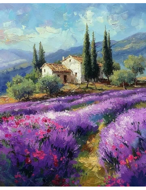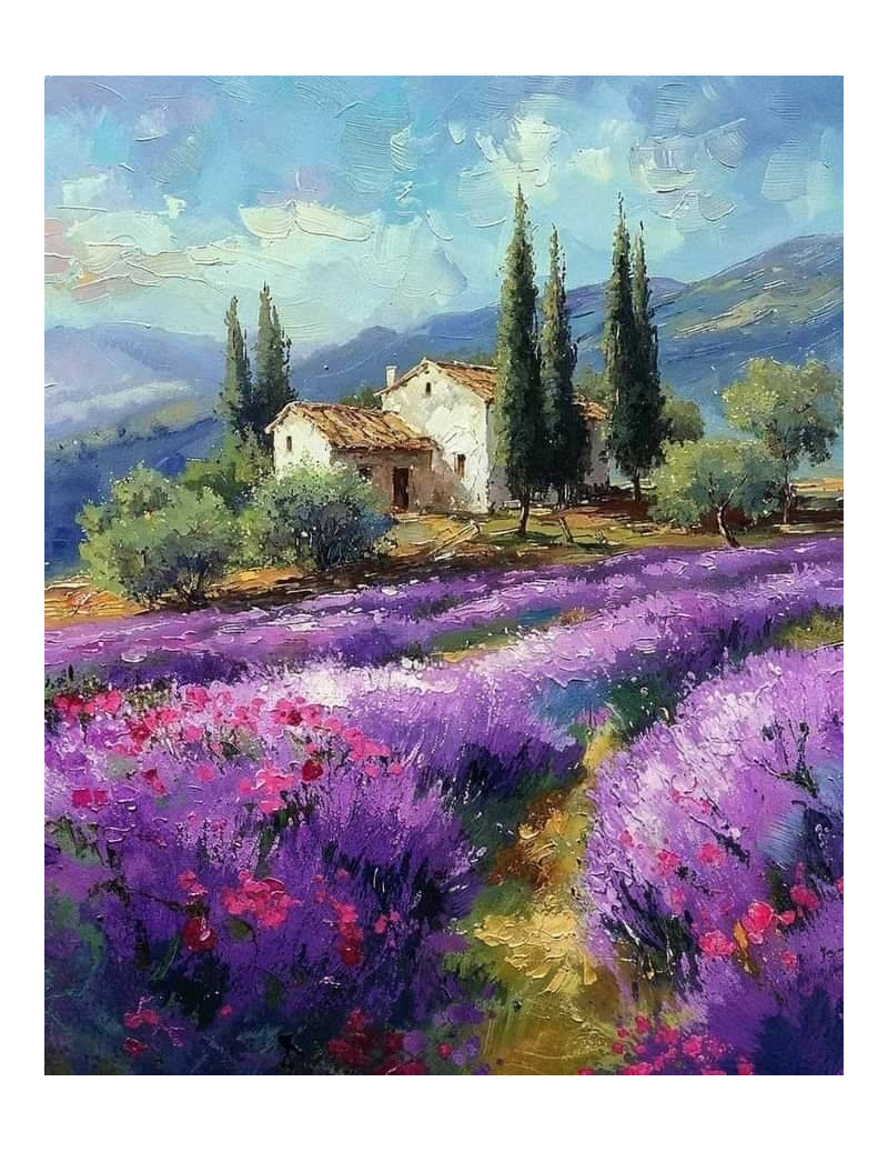 Malowany grubo nałożoną farbą, szpachlą i pędzlem obraz, przedstawia Toskanię i miłe wspomnienie z wakacji. Doskonały widok z domkiem i polem lawendowym do kuchni, czy gabinetu. Nastrojowa abstrakcja.