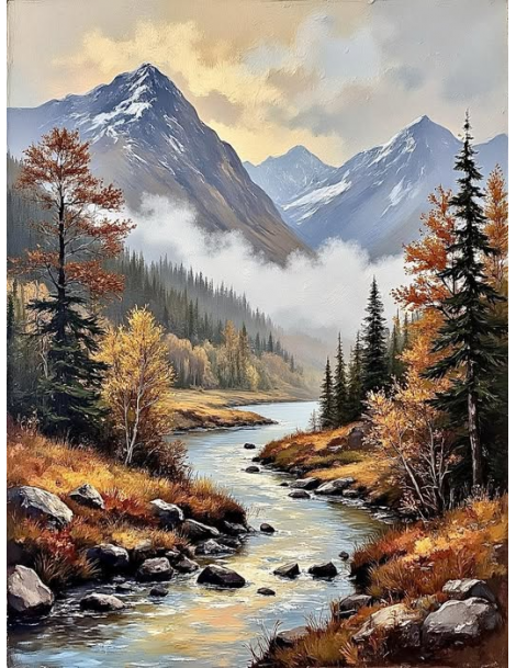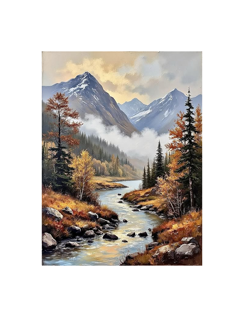 Piękny pejzaż, obraz na płótnie. Widok na góry, potok, las i chatka