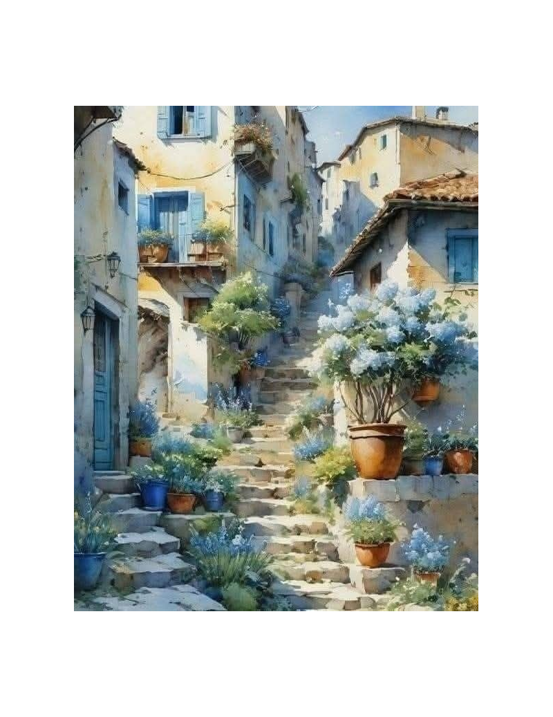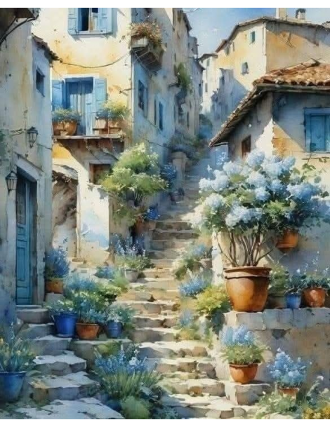 Obraz przedstawia urokliwą uliczkę w stylu śródziemnomorskim, tętniącą ciepłymi odcieniami żółci i błękitu. W powietrzu unosi się zapach wilgotnych kamieni i świeżych kwiatów w doniczkach, albowiem wszędzie widać rozkwitające rośliny. Ściany kamiennych domów wznoszą się stromo po obu stronach wąskich schodów, a między nimi rozpychają się zielone krzewy i pnącza. Łagodny światłocień dodaje całości subtelnego uroku, tworząc nieco idylliczną atmosferę pełną spokoju i nostalgii. W tym wszystkim czuć ducha dnia wakacyjnego, kiedy czas płynie wolniej, a wieczorne światło rzeźbi cienie na fasadach.