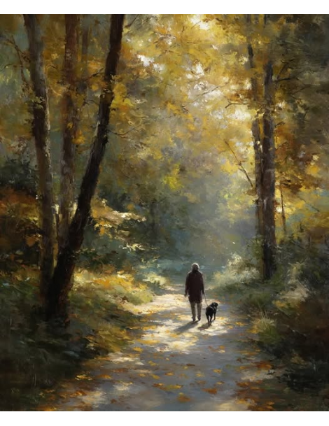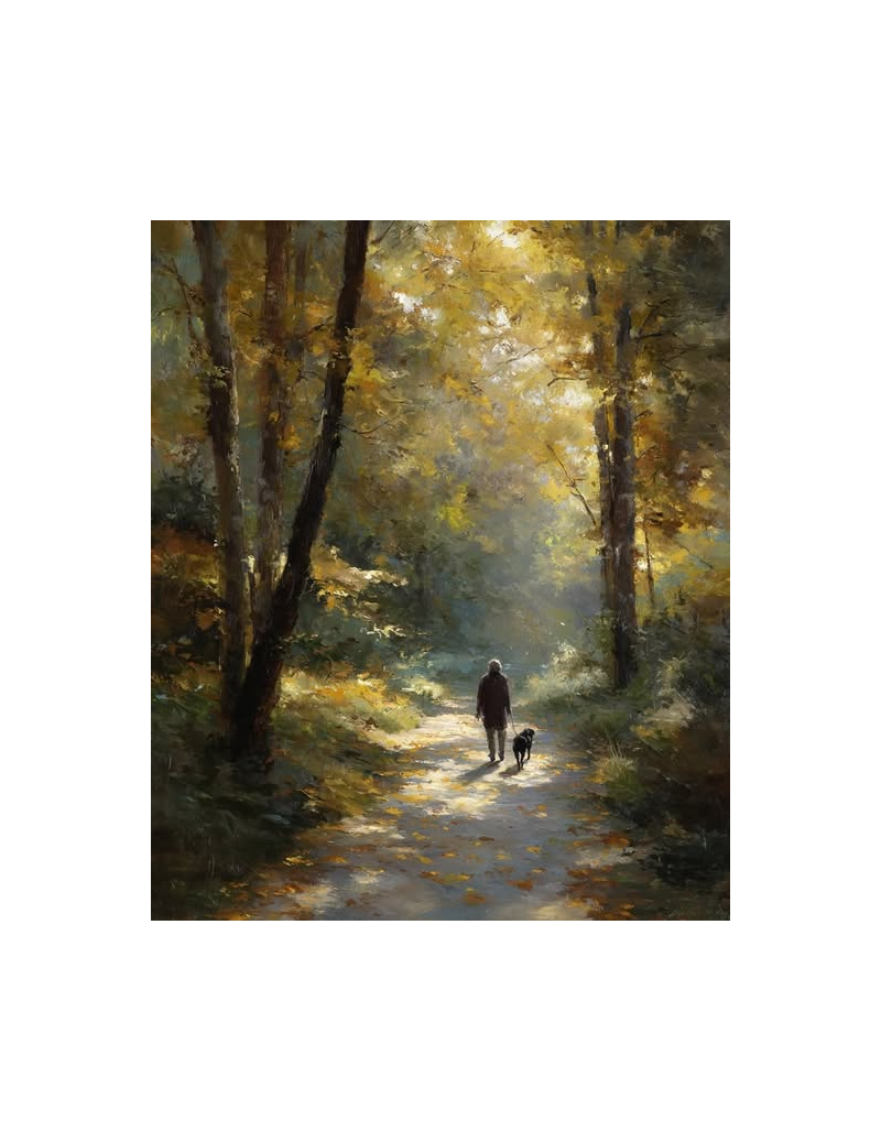 Jesień. Samotna postać i wierny towarzysz pies labrador, razem wędrują przez światłość i cień, jakby czas uginał się, aby uczcić ich podróż – wieczną drogę zaufania, pamięci i szeptanej łaski pod świecącym baldachimem złotych liści...