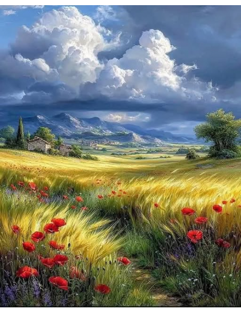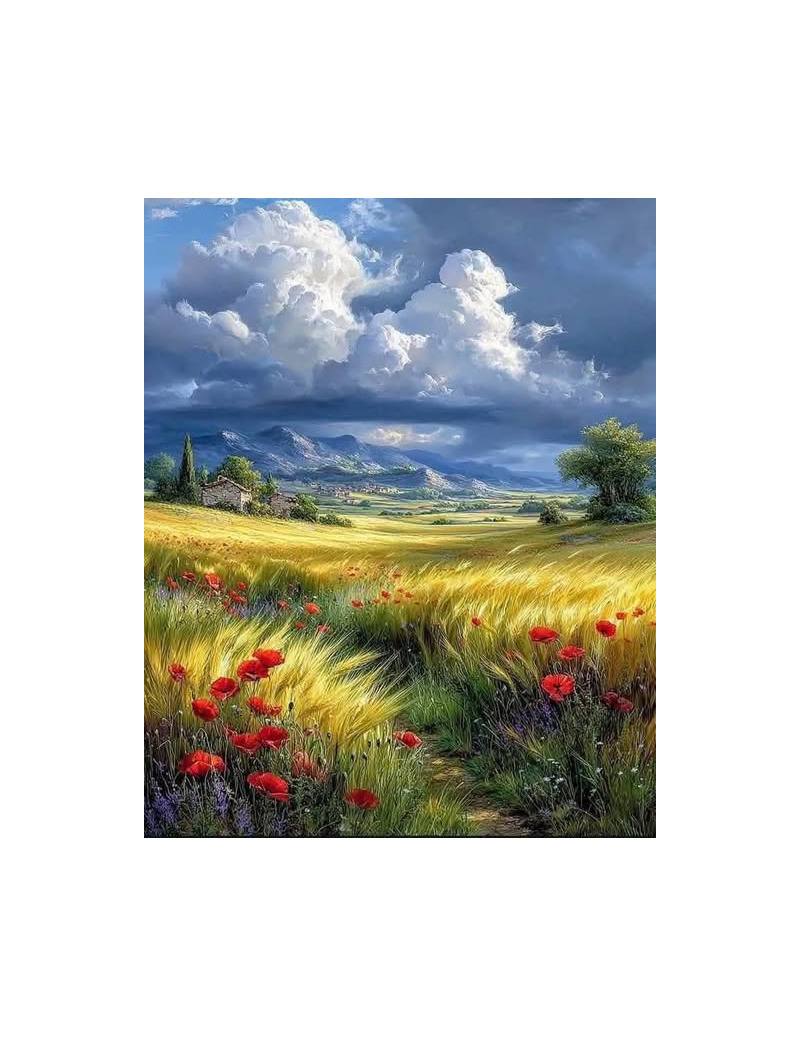 obraz olejny, prezent, zboże, góry, widok, pejzaż, maki, oil, canvas, pole, łany, złoto, gold, chmury, burza
