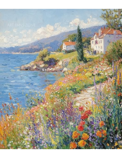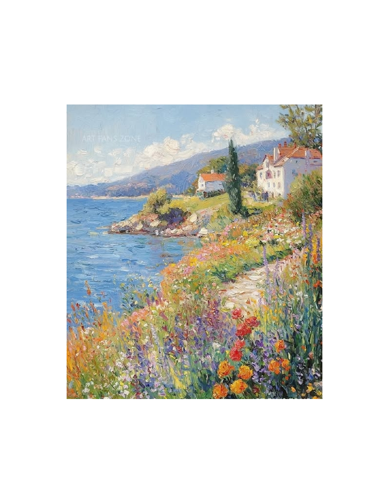 Obraz olejny, pejzaż śródziemnomorski, morze, domki, zatoka, turkus, fale, ogród, zioła, wakacje, lato, prezent, zamówienie, cyprysy, impresjonizm, van Gogh, łąka, kwiaty