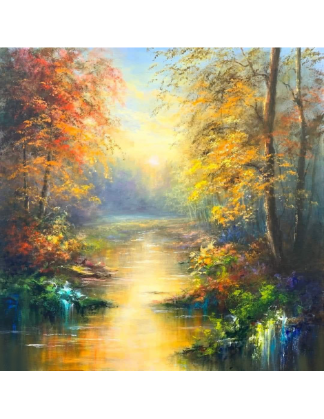 Malowniczy krajobraz jesiennego lasu, gdzie złociste liście delikatnie opadają do spokojnej wody. Barwy są żywe i pełne kontrastów: od głębokiej czerwieni po jaskrawe żółcie. Krajobraz tworzy kompozycję, w której centrum dominuje jasny strumień. Słońce odbija się w powierzchni wody, dodając blasku całemu pejzażowi. Nastrój obrazu magiczny i uspokajający, idealny moment zadumy. Artysta użył techniki impasto, co nadaje fakturę liściom i wodzie, tworzy wrażenie trójwymiarowości. Choć obraz wydaje się realistyczny, ma w sobie nutę impresjonizmu. Budzi spokój, jakby czas stanął w miejscu. Artysta uchwycił grę światła i cienia. Obraz prosty w swej formie, emanuje głębią emocji, zachęcając do refleksji nad pięknem natury. Dzieło, sprawia, że jest chęć wyruszenia na spacer w ten magiczny las.