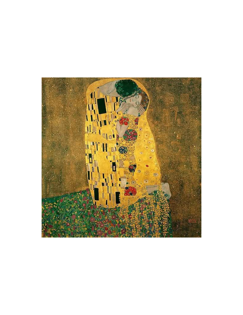 Obraz wypełnia ciepłe złoto migoczące niczym słońce na zmierzchu. Para spleciona w intymnym uścisku, owinięta bogatą, złotą tkaniną ozdobioną geometrycznymi wzorami, które niemalże hipnotyzują. Kolory są jaskrawe i żywe — od głębokiego złota po bogaty zieleń łąki usianej kwiatami. Całość zachwyca swą harmonią, podczas gdy tło w kolorze złocistego brązu dodaje mu głębi. Klimat obrazu jest spokojny, ale i pełen uczuć, przywodząc na myśl ideę bezgranicznej miłości. Stylistyka przepełniona jest dekoracyjnością typową dla secesji. Technika artysty sprawia, że dzieło emanuje blaskiem niczym skarby dawnych czasów. Nastrojowa aura sugeruje wieczność. Odkrywaj detale i niewidoczne na pierwszy rzut oka symboliki.