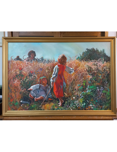 Obraz emanuje ciepłem i nostalgią. Dominują tu złociste odcienie zbóż oraz miękkie, niebieskie i zielone akcenty roślinności. Niczym w bajce, cała scena zanurza się w złotym świetle, a dzieci bawią się beztrosko pośród łanów zbóż. Jedno dziecko, w czerwonej sukience, idzie w kierunku widza, a drugie siedzi na ziemi, otoczone kwiatami i zielenią. W tle majaczą postacie w kapeluszach. Atmosfera obrazu jest sielankowa i pełna spokoju. Artysta zastosował technikę malowania impastem, co dodaje tekstury i głębi kolorom. Farba jest nakładana dość swobodnie, przez co wywołuje wrażenie ruchu w zbożu i dziecięcej lekkości. Letni wiatr i trawy.